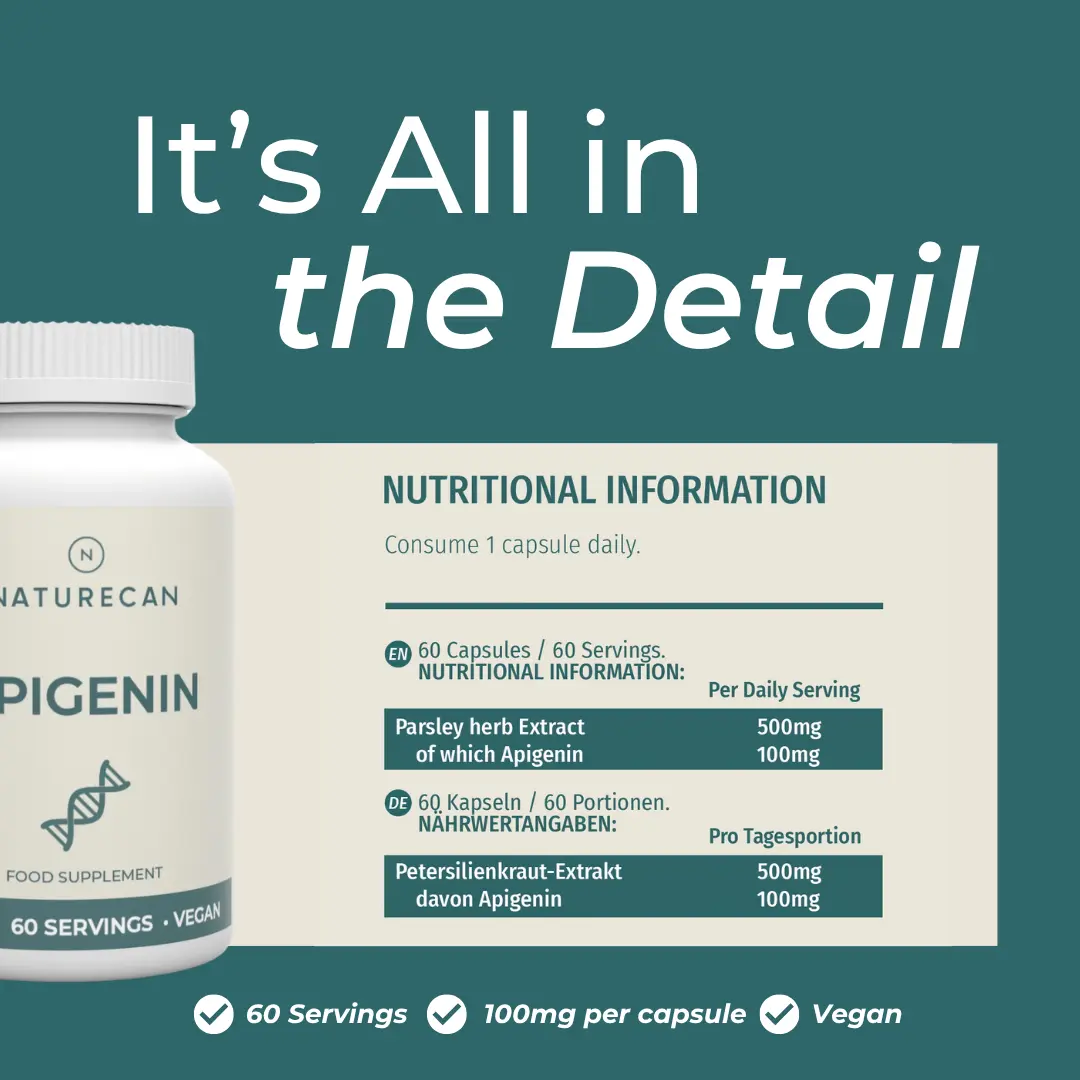 En Naturecan, la calidad es la base de todo lo que hacemos. Nuestro suplemento de Apigenina está elaborado con extracto de perejil de alta calidad, una fuente sostenible de apigenina natural. Cada ingrediente es analizado por terceros para garantizar pureza, seguridad y eficacia.